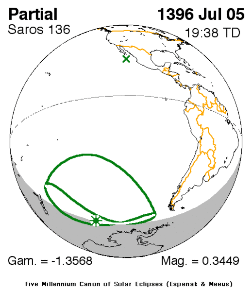 - Полное солнечное затмение 8 июня 1956 года с максимумом в 21:20:09 UT, наблюдавшееся в южной части Тихого океана, и полное солнечное затмение 11 июля 2010 года с максимумом в 19:33:33 UT, которое также наблюдалось в южной части Тихого океана, но уже несколько севернее. В данном случае экселигмос получился на 1 час 47 минут короче, чем 19 756 суток.