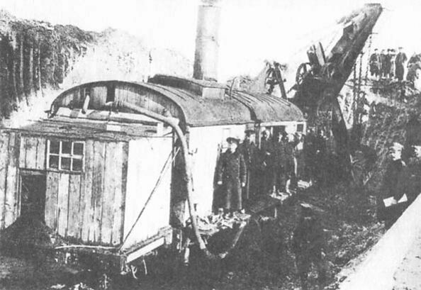 Позднее появились многоковшовые экскаваторы, или абзетцеры, которые имели огромные размеры и передвигались по рельсам, выкапывая желоба породы. С ними работало множество специальных машин, среди которых заметен путепередвигатель, передвигавший многочисленные рельсы экскаватора.