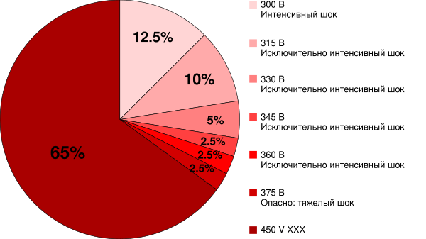 В одной серии опытов основного варианта эксперимента 26 испытуемых из 40 (65 %), вместо того, чтобы сжалиться над жертвой, продолжали увеличивать напряжение (до 450 В) до тех пор, пока исследователь не отдавал распоряжение закончить эксперимент. Лишь пятеро испытуемых (12,5 %) остановились на напряжении в 300 В, когда от жертвы появились первые признаки недовольства (стук в стену) и ответы перестали поступать. Ещё четверо (10 %) остановились на напряжении 315 В, когда жертва второй раз стучала в стену, не давая ответа. Двое (5 %) отказались продолжать на уровне 330 В, когда от жертвы перестали поступать как ответы, так и стуки. По одному человеку — на трёх следующих уровнях (345, 360 и 375 В). Оставшиеся 26 из 40 дошли до конца шкалы.