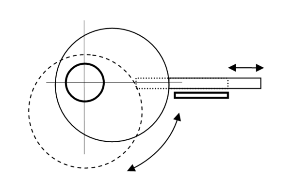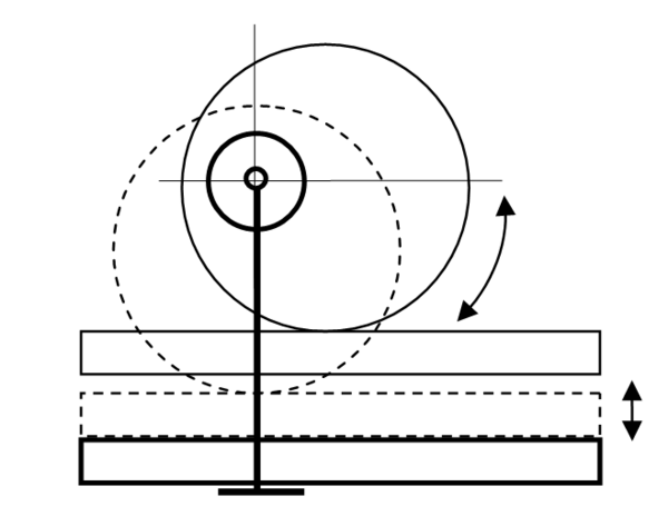 - Эксцентрик сам по себе выполнен как в предыдущем пункте, однако результирующее движение воспринимается в одной или в двух противоположных точках плоскостью (торцом) поступательного либо качающегося звена — толкателя. По своей сути это (простейший) вариант кулачкового механизма, создающий гармоничное движение, при котором перемещения толкателя пропорциональны косинусу (или синусу) угла поворота эксцентрика. Чаще всего применяется для привода поршней или мембран маломощных насосов (топливные насосы двигателей), а также для небольшого поступательного перемещения, например, преобразования вращательного движения ручки замка́ в возвратно-поступательное движение засова-защёлки.