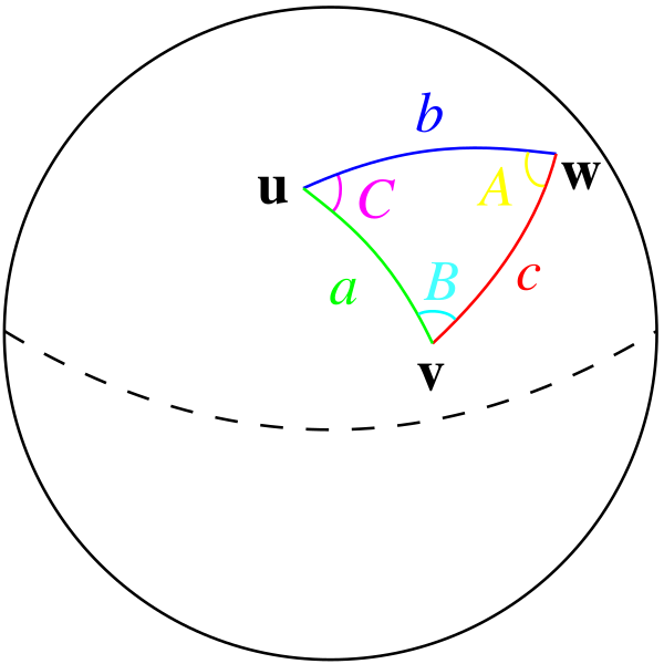- Для вычисления эксцесса сферического треугольника по сторонам a, b и углу C между ними используется формула[1]:95: