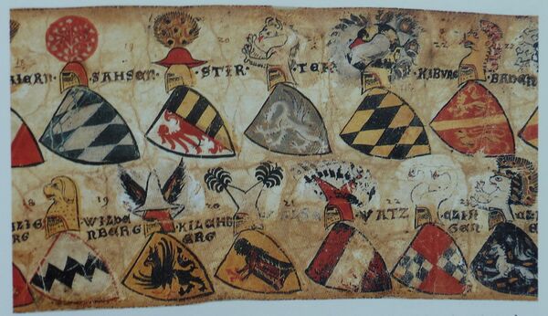 - Щит оживальной формы, несколько выше и уже предыдущего, появляется умбон (1350—1400).