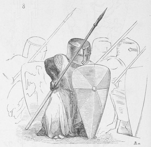 - Щит сохраняет предыдущую форму анфас, но становится изогнутым — нижний конец и верхний край отгибаются наружу, умбон становится более выступающим (1380—1420).