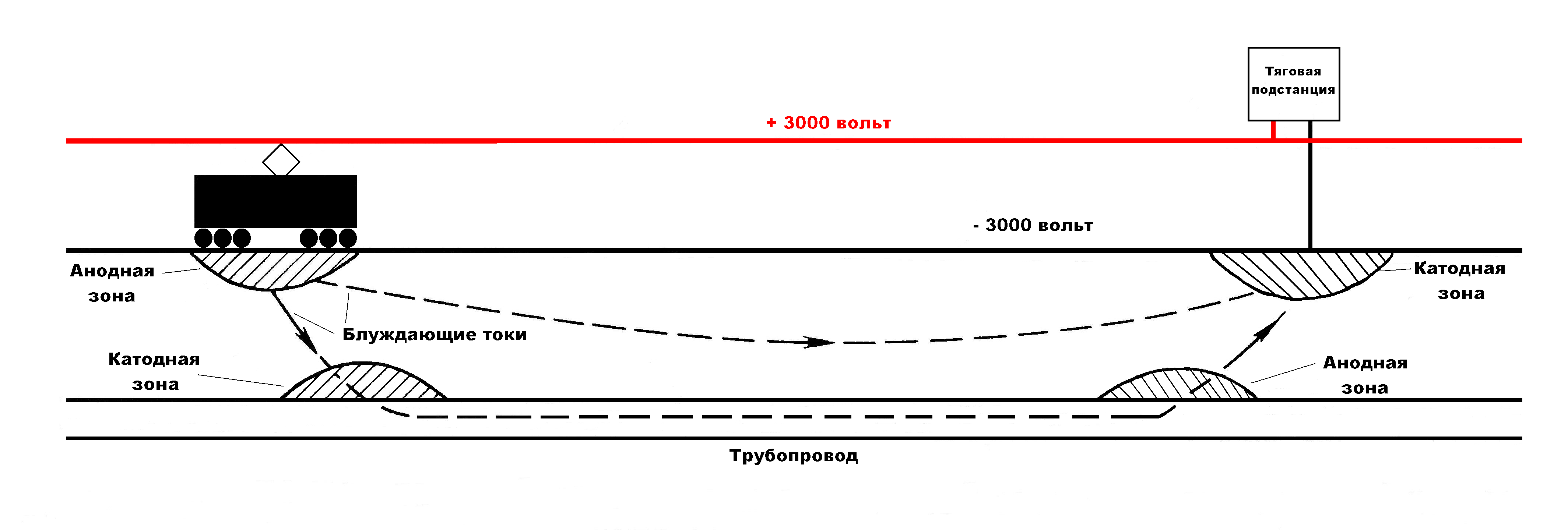Под колёсами электровоза образуется анодная зона, а на проходящем рядом трубопроводе — катодная зона (левая часть рисунка). Зоны на стыках анодной и катодной зон называются знакопеременными, потенциалы в них могут менять свою полярность. Также анодная и катодная зона образуется вблизи тяговой подстанции (правая часть рисунка). Наиболее интенсивно рельсы корродируют под колёсами электровоза, а подземные сооружения — у тяговых подстанций.