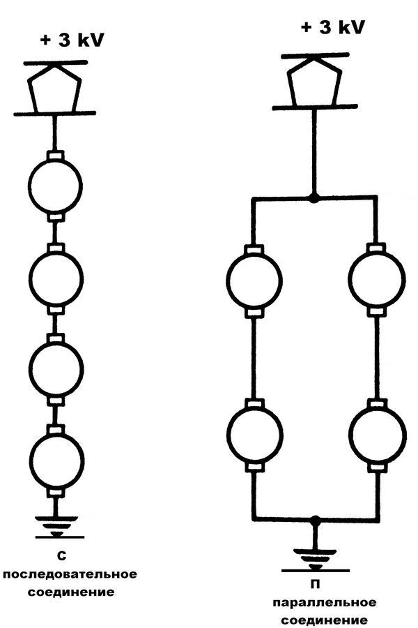На всех советских электровозах и электропоездах тяговые электродвигатели рассчитаны на напряжение 1500 В, поэтому они всегда соединены попарно последовательно (напряжение в контактной сети при этом 3000 В). Дело в том, что, если попытаться сделать электродвигатель на 3000 В с мощностью, равной электродвигателю на 1500 В, то масса и габариты высоковольтного двигателя окажутся больше, чем у низковольтного.