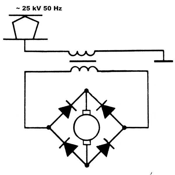 В ряде европейских стран (Германия, Швейцария и др.) используется система однофазного переменного тока 15 кВ 16⅔ Гц, а в США на старых линиях 11 кВ 25 Гц. Пониженная частота позволяет использовать коллекторные двигатели переменного тока. Двигатели питаются от вторичной обмотки трансформатора напрямую, без каких-либо преобразователей. Вспомогательные электродвигатели (для компрессора, вентиляторов и др.) также обычно коллекторные, питаются от отдельной обмотки трансформатора. Коллекторные двигатели, питаемые переменным током пониженной частоты, имеют лучшую коммутацию в сравнении с питанием током промышленной частоты.