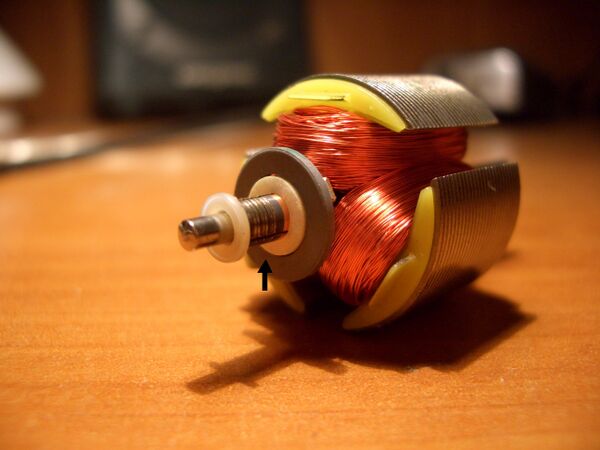Выводы всех катушек объединяются в коллекторный узел. Коллекторный узел обычно представляет собой кольцо из изолированных друг от друга пластин-контактов (ламелей), расположенных по оси (вдоль оси) ротора. Существуют и другие конструкции коллекторного узла.