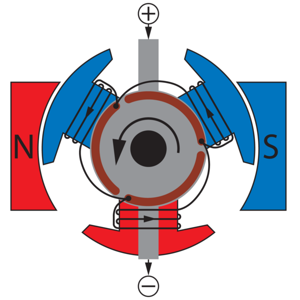 Этот двигатель можно ещё назвать синхронной машиной постоянного тока с самосинхронизацией. Простейший двигатель, являющийся машиной постоянного тока, состоит из постоянного магнита на индукторе (статоре), одного электромагнита с явно выраженными полюсами на якоре (двухзубцового якоря с явно выраженными полюсами и с одной обмоткой), щёточноколлекторного узла с двумя пластинами (ламелями) и двумя щётками.