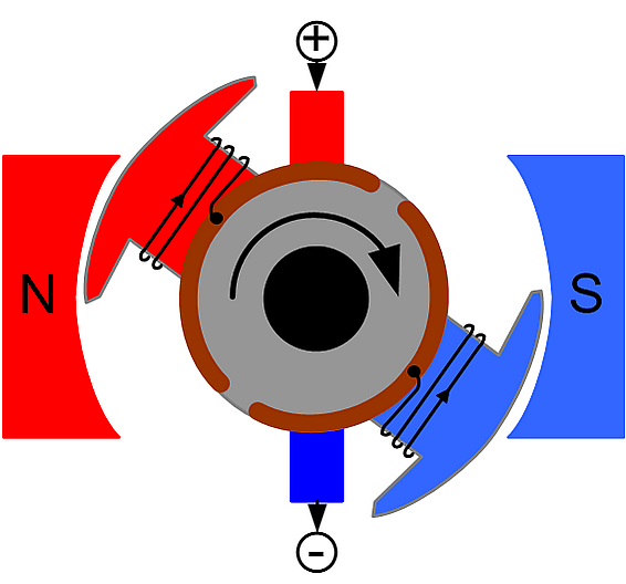 В простейшем случае статор имеет два полюса, то есть один магнит с одной парой полюсов. Но чаще ДПТ имеют две пары полюсов. Бывает и более. Помимо основных полюсов на статоре (индукторе) могут устанавливаться добавочные полюса, которые предназначены для улучшения коммутации на коллекторе.