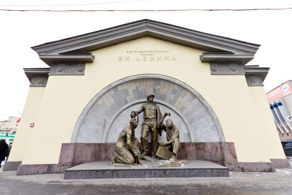 Наземный вестибюль выполнен в форме приземистого шестиугольного здания с массивным уплощённым куполом. В сводчатой нише вестибюля установлена скульптурная группа «Метростроевцы в забое» (скульптор Г. И. Мотовилов), изображающая трёх проходчиков с орудиями труда[5].
