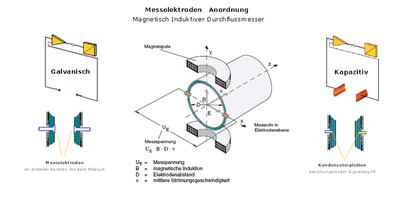 - трансформаторный эффект, когда на витке, образуемом жидкостью, находящейся в трубопроводе, электродами, соединительными проводами и вторичными приборами наводится трансформаторная ЭДС, источником которой является обмотка электромагнита или внешние синхронные наводки (например, от соседних расходомеров). Для их компенсации в измерительную схему прибора вводят компенсирующие цепи или питают электромагнит переключаемым постоянным током.
