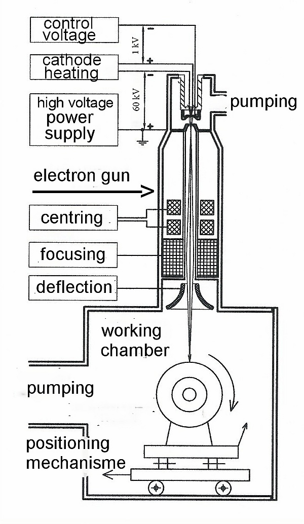 В состав установок для электронно-лучевой сварки входит электронная пушка, блоки питания. Электронно-лучевая пушка формирует пучок электронов с высокой плотностью энергии.