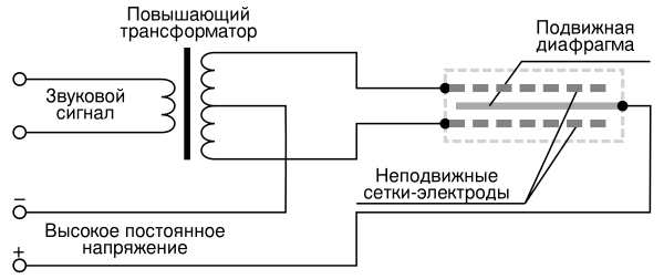 В основании акустической системы с электростатическими громкоговорителями располагают повышающий трансформатор и источник высокого напряжения (но при этом очень малого, то есть не опасного, тока).