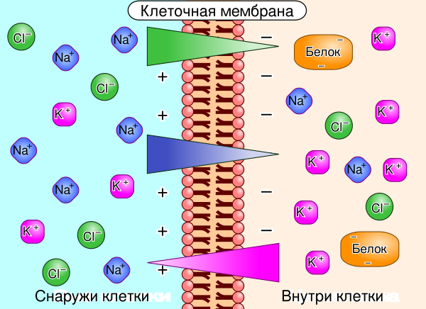 Так как ионы несут заряд, они не могут пройти через мембрану путём облегчённой диффузии. Перенос ионов через мембрану возможен двумя путями, через активный или пассивный транспорт. Примером активного транспорта ионов является работа Na+-K+-АТФазы. Она катализирует реакцию гидролиза АТФ до АДФ и неорганического фосфата Фн. При гидролизе одной молекулы АТФ выделяется энергия, которая изменяет конформацию фермента, так, чтобы три иона Na+ транспортировались наружу, а два иона K+ транспортируются внутрь клетки. В результате содержимое клетки становится более отрицательно заряжённым, чем окружающая среда, генерируется электрический потенциал (ЭДС) Vm ≈ -60 мВ[7]. Примером пассивного транспорта является ток ионов через ионные каналы (каналы для Na+, K+, Ca2+ и Cl-) по градиенту концентрации, из области большей концентрации в область меньшей. Например, так как существует высокая концентрация Na+ вне клетки, то ионы Na+ будут стремиться проникнуть в клетку через натриевый ионный канал. Поскольку электрический потенциал внутри клетки отрицательный, приток положительных ионов вызовет деполяризацию мембраны, вследствие чего происходит сдвиг значения трансмембранного электрического потенциала ближе к нулю. Однако ионы Na+ продолжат движение вниз по градиенту концентрации, до тех пор пока движущая сила химического градиента больше, чем электрического потенциала. После того как эффект обоих градиентов (химического и электрического) уравновесит друг друга (Vm для Na+ составляет около +70 мВ), приток ионов Na+ остановится, поскольку движущая сила или изменение энергии Гиббса (ΔG) станет равна нулю. Уравнение для движущей силы выглядит следующим образом[15][16]: