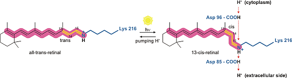 Бактериородопсин, обнаруженный в археях, формирует путь для градиента протонов, посредством протонного насоса. Работа протонного насоса опирается на переносчик протонов (родопсин), который движется от стороны мембраны с низкой концентрацией ионов H+ к стороне с более высокой концентрацией H+. Протонный насос бактериородопсина активируется путём поглощения фотонов с длиной волны 568 нм, это приводит к фотоизомеризации основания Шиффа (SB) в ретинале, вызывая его переход из транс- в 13-цис-форму. Фотоизомеризация чрезвычайно быстра и занимает всего 200 фемтосекунд. Как следствие, родопсин претерпевает ряд быстрых конформационных перестроек: происходит смещение основания Шиффа от остатков Asp85 и Asp212, вызывая передачу ионов H+ остатку Asp85, при этом формируется состояние M1 (мета-I). Затем белок переходит к состоянию М2 (мета-II) посредством отделения остатка Glu204 от Glu194, который высвобождает протон во внешнюю среду. Такое состояние является сравнительно долгоживущим. Основание Шиффа репротонируется по остатку Asp85, формируя состояние N. Важно, что второй протон происходит от Asp96, так как его депротонированное состояние неустойчиво и быстро репротонируется (повторно протонируется) протоном из цитоплазмы. Протонирование Asp85 и Asp96 приводят к повторной изомеризации SB, формируя при этом состояние O. Также при этом остаток Asp85 высвобождает свой протон на Glu204 и бактериородопсин возвращается в состояние покоя[18][19].