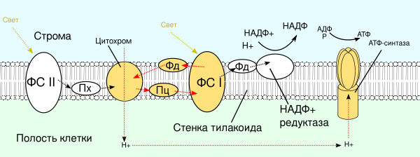 Подобно дыхательной цепи переноса электронов действует и электронтранспортная цепь фотосинтеза в растениях, где происходит закачка протонов в люмен хлоропластов (просвет тилакоидов), а полученный градиент используется для синтеза АТФ посредством фермента АТФ-синтазы. Протонный градиент может быть сгенерирован с помощью нециклического или циклического фотофосфорилирования. Белки, которые участвуют в нециклическом фотофосфорилировании, фотосистема II (ФСII) и цитохром-b6f-комплекс непосредственно способны к генерации протонного градиента. На каждый из четырёх фотонов, поглощаемых ФСII, приходится восемь протонов, которые перекачивается в люмен (просвет тилакоида) из стромы[12]. Общее уравнение для фотофосфорилирования выглядит следующим образом: