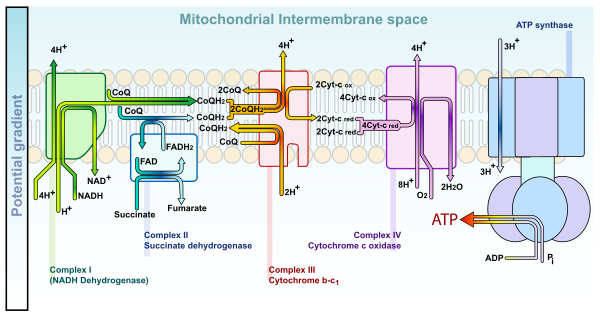 Электрохимические градиенты также играют определённую роль в установлении протонных градиентов окислительного фосфорилирования в митохондриях. Конечной стадией клеточного дыхания является цепь переноса электронов. Четыре встроенных комплекса во внутренней мембране митохондрии (кристах) составляют цепь переноса электронов. Однако только комплексы I, III и IV являются протонными насосами и перекачивают протоны из матрикса в межмембранное пространство. Суммарно получается десять протонов, которые перемещаются из матрикса в межмембранное пространство, генерируя электрохимический потенциал более 200 мВ. Это приводит в движение поток протонов обратно в матрикс через АТФ-синтазу, которая синтезирует АТФ путём присоединения неорганического фосфата к молекуле АДФ[9]. Таким образом, генерация протонного электрохимического градиента имеет решающее значение для синтеза энергии в митохондриях[10]. Общее уравнение для цепи переноса электронов выглядит так: