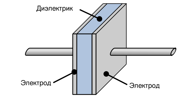 Конденсатор является пассивным электронным компонентом[3]. В простейшем варианте конструкция состоит из двух электродов в форме пластин (называемых обкладками), разделённых диэлектриком, толщина которого мала по сравнению с размерами обкладок.