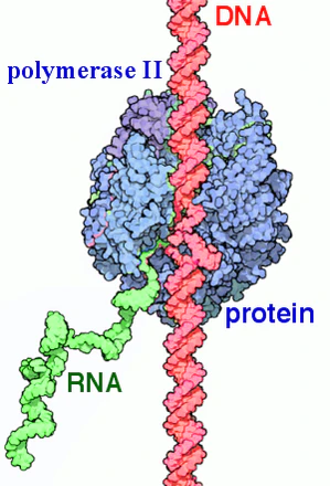 У прокариот и у эукариот процесс удлинения растущей цепи мРНК в общих чертах протекает одинаково. РНК-полимераза сдвигается с промотора, перемещается вдоль двойной спирали ДНК в направлении 3'→5', раскручивает спираль перед участком, на котором происходит синтез РНК. На короткое время образуется, так называемый, «открытый» комплекс, внутри которого возникает гибридная спираль ДНК-РНК длиной порядка 20 нуклеотидов. Синтез мРНК идёт согласно принципу комплементарности, затем фермент вновь закручивает ДНК за участком полимеризации[4]. Синтез транскрипта прерывист, периоды быстрой элонгации перемежаются краткими паузами, во время которых активный участок полимеразы подвергается некоторой структурной перестройке. Паузы редко продолжаются более чем 6 миллисекунд и могут сопровождаться обратным перемещением полимеразы по матрице[3]. Выведение РНК-транскрипта из комплекса осуществляется через особый канал на РНК-полимеразе[4].