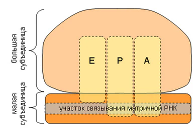На этапе элонгации тРНК, комплементарная второму кодону на мРНК и несущая аминокислоту, поступает в А-сайт рибосомы. Между формилметионином, находящемся в Р-сайте рибосомы, и аминокислотой, доставленной тРНК в А-сайт, в пептидилтрансферазном центре образуется пептидная связь. После образования пептидной связи, полипептид оказывается связанным с тРНК, которая находится в А-сайте. Далее происходит транслокация: деацилированная формилметионил-тРНК перемещается из Р-сайта в Е-сайт, пептидил-тРНК перемещается из А-сайта в Р-сайт, мРНК продвигается на один кодон. Этот процесс сопровождается затратами энергии (ГТФ), также у нём участвует специальный транслокационный белковый фактор (EF-G). Затем тРНК, комплементарная следующему кодону мРНК, связывается с освободившимся А-сайтом рибосомы, происходит повторение выше описанных этапов, с каждым циклом полипептид удлиняется на один аминокислотный остаток[4].