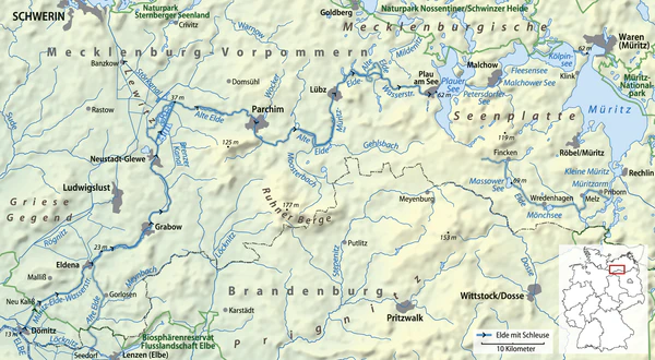 Исток и верхнее течение реки расположены на юге и юго-западе земли Мекленбург-Передняя Померания, а нижнее и северное пролегают на севере земли Бранденбург. Река соединяет озеро Мюриц с рекой Эльба.