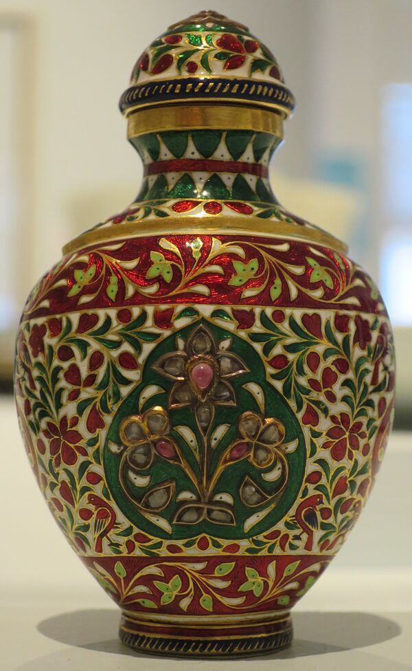 Роспись эмалевыми красками по металлу, изобретённая в Европе в 16 веке, была принесена в Китай миссионерами-иезуитами в начале 18 века и вызвала большой интерес у ценителя искусств императора Канси. В 1713 году он распорядился основать в Пекине императорскую мастерскую эмалевой росписи, которая поначалу испытывала большие технические трудности. С целью их преодоления были вызваны мастера из Кантона (Гуанчжоу), где, по-видимому, подобные мастерские к тому времени уже существовали. В 1717 году в Пекин прибыл французский мастер-эмальер Жан-Батист Гравро, благодаря которому техника эмалевой росписи была существенно улучшена. Металлической основой для эмалевой росписи обычно служила медь, покрывавшаяся несколькими слоями одноцветной, как правило, белой эмали, служившей фоном для росписи. Помимо удовлетворения потребностей внутреннего рынка, в Кантоне был налажен массовый экспорт предметов декоративно-прикладного искусства в Европу, ставших известными под общим названием «кантонская эмаль».