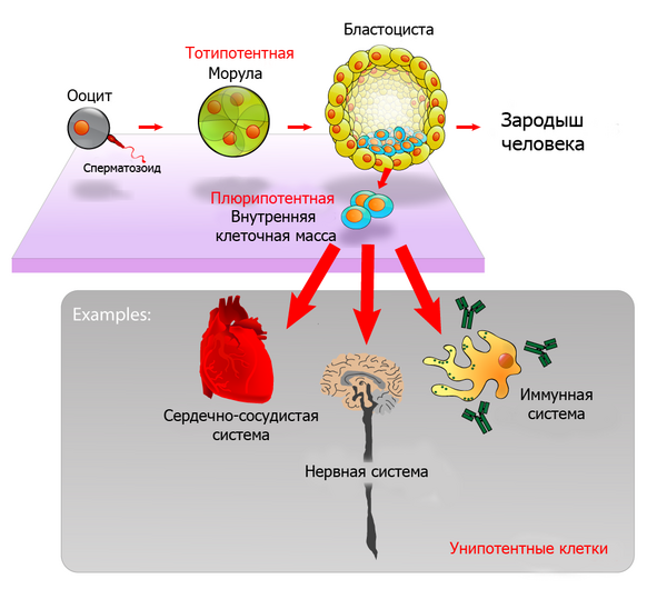 Эмбриональные стволовые клетки являются плюрипотентными. Это означает, что они могут дифференцироваться во все три первичных зародышевых листка: эктодерму, энтодерму и мезодерму. Плюрипотентные клетки способны к дифференцировке во все типы клеток взрослого организма, которых насчитывается около 220. Свойство плюрипотентности отличает эмбриональные стволовые клетки от мультипотентных клеток, которые могут дать начало лишь ограниченному количеству типов клеток. В отсутствие стимулов к дифференцировке in vitro эмбриональные стволовые клетки могут поддерживать плюрипотентность в течение многих клеточных делений. Это свойство называется способность к самообновлению (англ. self-renewal). Наличие плюрипотентных клеток у взрослого организма остаётся объектом научных дискуссий, хотя исследования показали, что существует возможность получения плюрипотентных клеток из фибробластов взрослого человека в лабораторных условиях в процессе так называемого репрограммирования клеток[2].