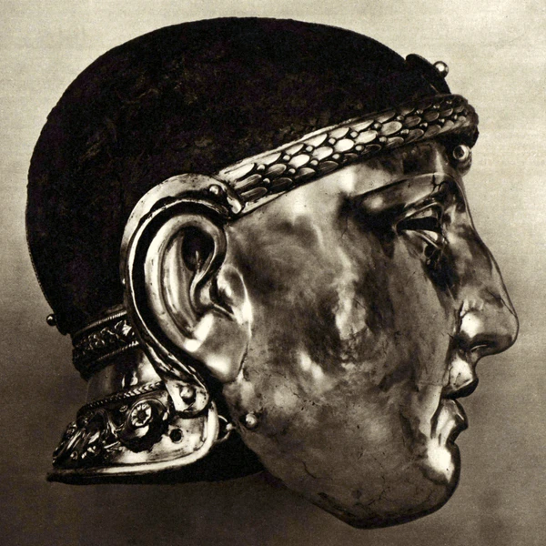 Красивый и функциональный шлем, очевидно, надевался на парады и в сражения. Он не подходит для кавалерийских сражений из-за тонких пластин, но затылочная часть из железа может уберечь от стрел лучников. Узкие прорези для глаз с тремя небольшими отверстиями под ними расширяют обзор, что увеличивает шансы для защиты. Грубость выделки этих отверстий свидетельствует о поспешном их изготовлении из срочной необходимости.