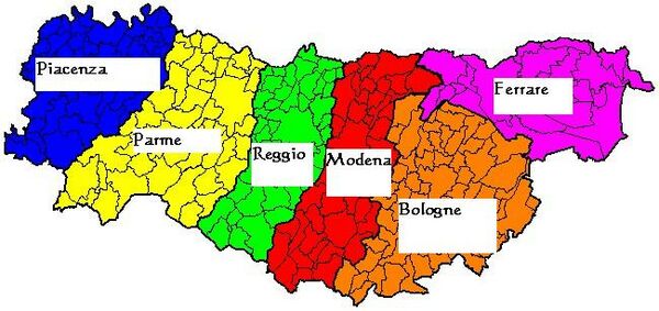 В пределах нынешнего административного региона Эмилия-Романья Эмилия включает в себя провинции Пьяченца, Парма, Реджо-нель-Эмилия, Модена, Феррара и большую часть провинции Болонья (за исключением коммун Борго-Тоссиньяно, Казальфьюманезе, Кастель-дель-Рио, Доцца, Фонтанеличе, Имола и Мордано, и долины реки Сантерно).