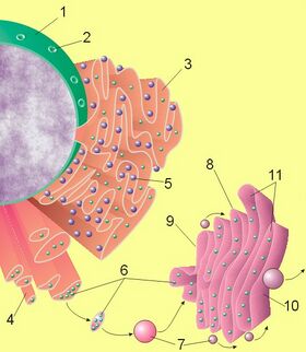 (5) Рибосомы на поверхности гранулярного эндоплазматического ретикулума.