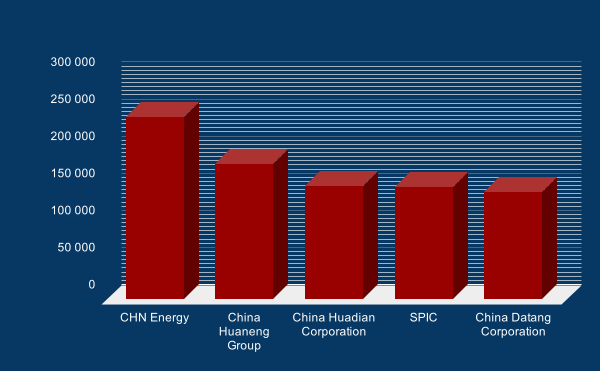 - Крупнейшие энергетические компании, имеющие генерирующие активы[6]: CHN Energy (China Energy Investment Corporation), CHNG (China Huaneng Group), CHD (China Huadian Corporation), SPIC (State Power Investment Corporation) и CDT (China Datang Corporation).
