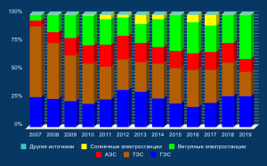 На конец 2019 г. доля ветряных электростанций (ВЭС) и солнечных электростанций (СЭС) в структуре установленной мощности-брутто электростанций Китая составляла соответственно 10,4 и 10,2 %. В структуре производства электроэнергии на долю ВЭС приходится 5,5 % и СЭС — 3,1 %.
