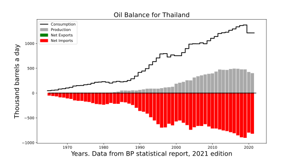 - Производство: Таиланд впервые начал добывать нефть[5] в 1981 году по 2000 баррелей (84 000 американских галлонов) в день. К 2013 году суточная добыча нефти возросла до 459 000 баррелей. Доказанные запасы нефти оцениваются в 0,4 тыс. млн баррелей.