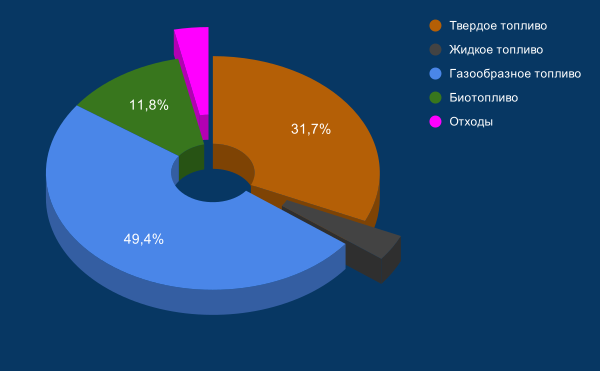 Суммарный объём энергоносителей на преобразование — свыше 1485 млн toe или 93,5 % от общей поставки. Доля энергоносителей на преобразование на электростанциях и отопительных установках от последнего показателя — почти 43 %.