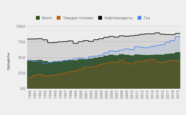 Динамика энергетической зависимости* ЕС по отдельным группам энергоносителей и в целом за период 1990—2019 гг., по данным Eurostat[6], иллюстрируется следующей диаграммой[7]: