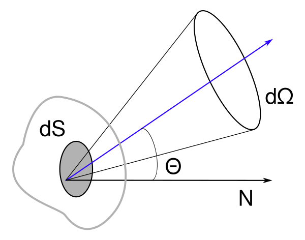 где — угол между нормалью к излучающей площадке и рассматриваемым направлением, — площадь площадки, а — площадь упомянутой выше проекции.
