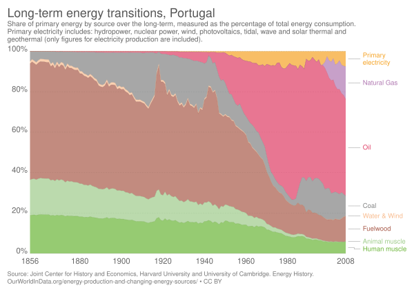 Хронологически первый подход наиболее широко описал Вацлав Смил[22]. Он подчёркивает изменение энергобаланса стран и мировой экономики по отдельным видам первичных источников энергии в процентах от общего объёма энергопотребления. Этот подход описывает изменения в энергосистемах с течением времени, от биомассы к углю, к нефти, а теперь и к комбинации источников, в основном состоящей из угля, нефти и природного газа. До 1950-х годов экономический механизм, лежащий в основе энергетических систем и энергопереходов, был скорее локальным, чем глобальным[23].