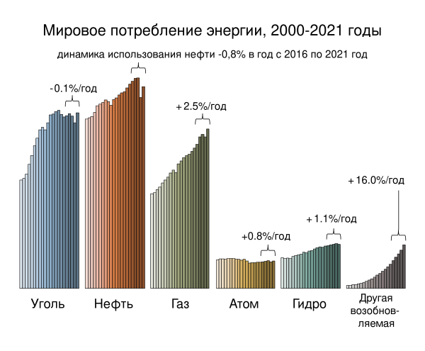 - третий энергопереход — расширение использования газа (1930 год — 3 %, 2017 год − 23 %);