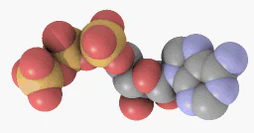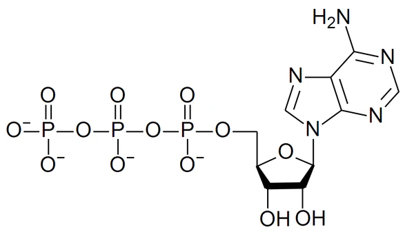 Молекула АТФ состоит из аденина, соединённого с рибозой, к которой присоединены три фосфатные группы. Первая фосфатная группа обозначается как α, вторая — β, третья — γ. Высокоэнергетические связи между β и γ фосфатами являются источником энергии для клеточных процессов.