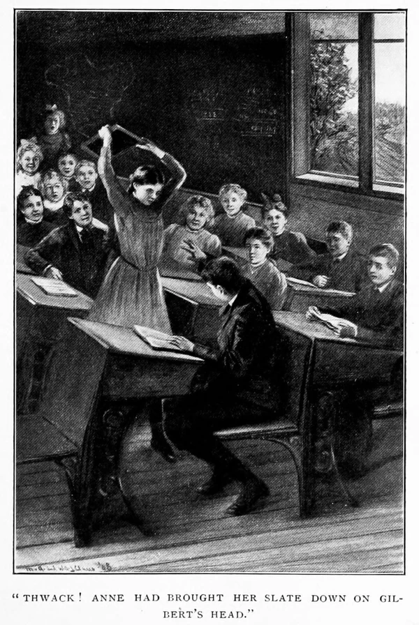 Сложные отношения сложились у Энн с одноклассником Гилбертом Блайтом. В первый её день в школе он дёрнул её за косу и назвал «морковкой», что задело Энн, всегда переживающей из-за своего цвета волос. Энн в ярости разбила грифельную дощечку о голову обидчика и впредь старалась игнорировать мальчика, несмотря на его попытки загладить свою вину, и вести с ним негласное соперничество по успеваемости в школе. Позже они стали одними из лучших учеников Королевского колледжа.