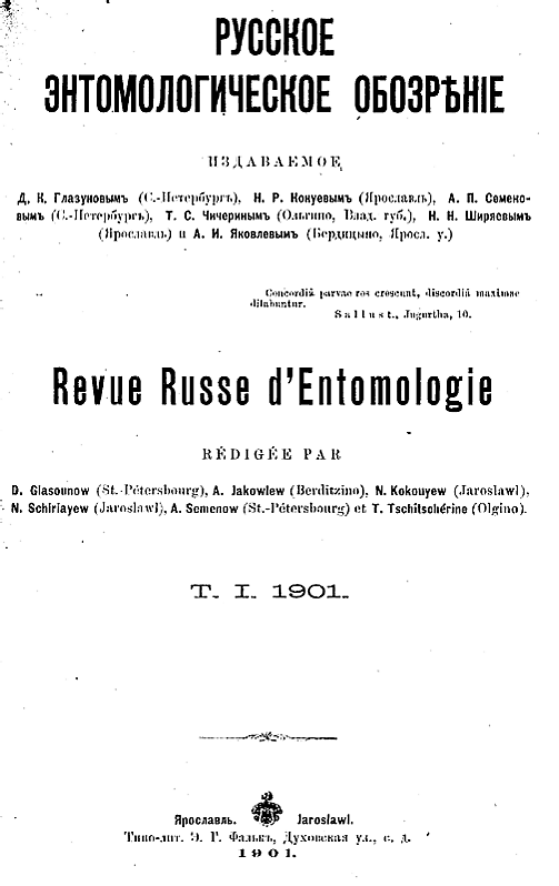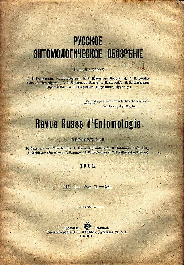 Основан в 1901 году в Ярославле как «Русское энтомологическое обозрение» и издавался на личные средства энтомологами Д. К. Глазуновым, Н. Р. Кокуевым, А. П. Семёновым-Тян-Шанским, Т. С. Чичериным, Н. Н. Ширяевым и А. И. Яковлевым. Журнал несколько раз менял название и издателей[3][1][4].