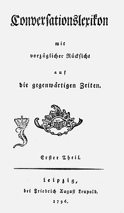История энциклопедии начинается с 1796 года, когда в Лейпциге начал выходить «Энциклопедический словарь с замечательным вниманием к теперешним временам» (нем. Conversations-Lexikon mit vorzüglicher Rücksicht auf die gegenwärtigen Zeiten) под редакцией доктора Ренатуса Готтхельфа Лёбеля (1767—1799). «Словарь…» включал статьи по географической и исторической тематике, биографии, статьи по мифологии, философии, естествознанию и пр. Тома 1—4 (от A до R; издание «Leipzig: F. A. Leupold») вышли в 1796—1800 годах, том 5 (издание «Leipzig: J. C. Werther») появился в 1806 году.