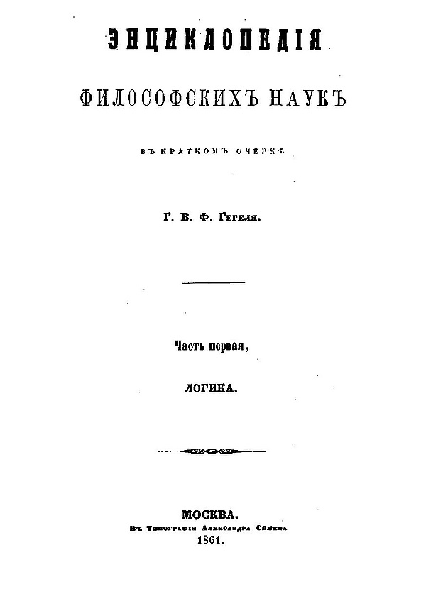 - Г. В. Ф. Гегель. Энциклопедія философскихъ наукъ въ краткомъ очеркѣ. Ч. 1. Логика / Пер. В. П. Чижова. — М., 1861.