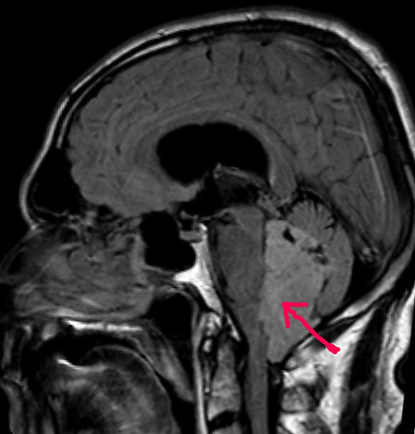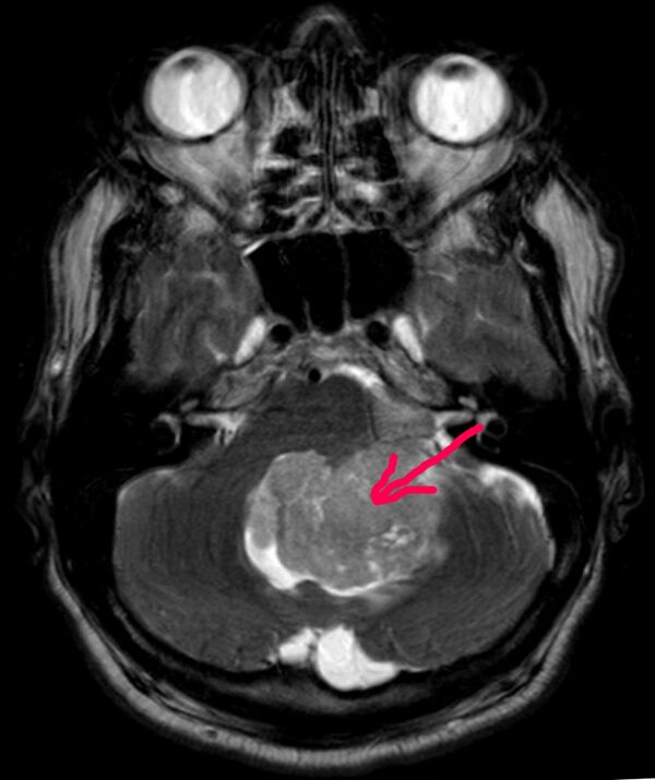 Клиническая картина заболевания, характер и длительность течения в основном определяются тем, в каком отделе IV желудочка она располагается и куда направлен её рост. Смерть обычно наступает либо из-за паралича дыхательного центра, вследствие его сдавления, либо из-за развития дислокации мозга — смещения миндалин мозжечка в затылочное отверстие[21].