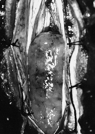 Удаление эпендимом спинного мозга производится с применением заднего доступа. После ламинэктомии (удаления задних отделов позвоночника) вскрывается твёрдая мозговая оболочка. Срединный разрез спинного мозга над тканью эпендимомы позволяет её визуализировать. После этого производится по возможности тотальное удаление новообразования[40].