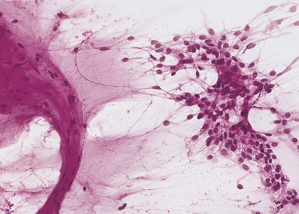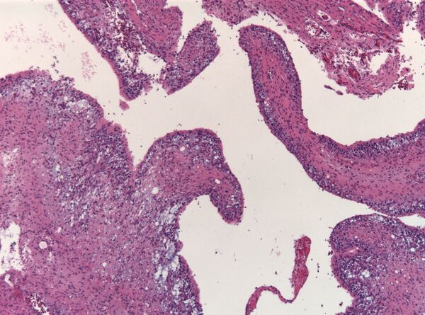 - Миксопапиллярная эпендимома располагается экстрамедуллярно, чаще в области конского хвоста. Для ткани данного типа опухоли характерны слизистая дистрофия, расплавление ткани и образование слизистых кист.