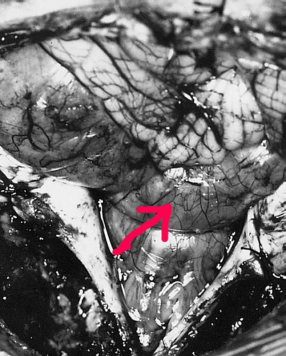 Наиболее характерной особенностью опухолей боковых желудочков является интермиттирующее течение заболевания, и в первую очередь изменчивость интенсивности головных болей. Располагаясь в полости боковых желудочков, особенно вблизи отверстия Монро, через которое ликвор оттекает из боковых в III желудочек, опухоль в зависимости от положения головы действует как клапан. При закупорке отверстия Монро боковой желудочек выключается из общей системы ликворотока. Вследствие этого развивается односторонняя гидроцефалия, которая нередко приводит к возникновению острого гипертензионного криза. Он проявляется резкой, распирающей головной болью, рвотой, затемнением или утратой сознания. Временной закупоркой желудочка объясняют приступообразный характер головной боли, которая возникает на начальных этапах заболевания, длительные светлые промежутки. С клапанообразным механизмом закрытия отверстия Монро связывают вынужденное положение головы. Больной рефлекторно держит голову таким образом, чтобы головные боли были минимальными[20].