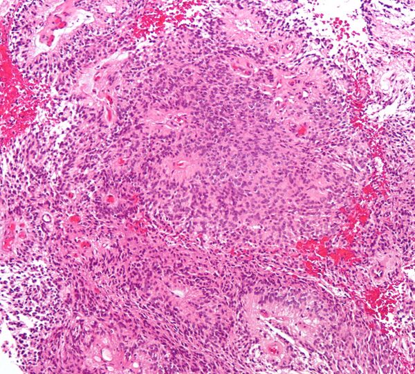 - Основным гистологическим типом является истинная эпендимома , для которой типично наличие периваскулярных и истинных «розеток». Периваскулярные «розетки» («псевдорозетки», «лучистая корона») состоят из клеток новообразования, которые располагаются вокруг кровеносных сосудов. В истинных «розетках» опухолевые клетки находятся вокруг каналов, которые выстланы эпендимарными клетками.