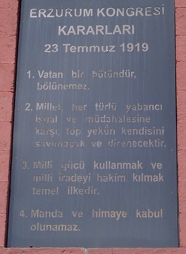 23 июля 1919 года 56 делегатов от вилайетов Битлис, Эрзурум, Сивас, Трабзон и Ван собрались в Эрзуруме, откликнувшись на призыв Мустафы Кемаля и Казыма Карабекира. В первый день своей работы они избрали Мустафу Кемаля председателем конгресса. На этом собрании был принят целый ряд важных решений, определивших будущий ход Турецкой войны за независимость. В частности, было подтверждено желание провинций остаться в составе Османской империи, а не быть разделёнными союзниками. Кроме того, было принято решение отказаться от принятия какой-либо формы мандата для империи и предоставления христианам, таким как греки или армяне, каких-либо особых привилегий; а также сопротивляться любым таким мерам, если их попытаются осуществить[11][12]. На конгрессе была сформулирована и первая версия Национального обета Турции (тур. Misak-ı Millî)[10]. Перед тем, как разойтись 17 августа, делегаты съезда избрали членов Представительного комитета (тур. heyet-i temsiliye) во главе с Мустафой Кемалем[13].