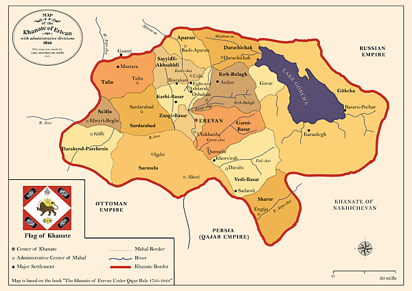 После убийства Надир-шаха в 1747 году и внутренних смут в Персии, наступивших при слабой Зендской династии, образовалось полу-самостоятельное Эриванское ханство[70]. Это было связано в том числе и с тем, что в период правления Сефевидов, персидский шах выделял обширные территории беглербегств (Чухур-Саад) местной знати и феодалам, а в дальнейшем, было закреплено право её наследственной передачи[71]. Правители Эриванского ханства принадлежали к тюркскому племени каджаров, поселённому в регионе в начале XV века Тамерланом, так же как и правившая в Персии династия Каджаров[72].